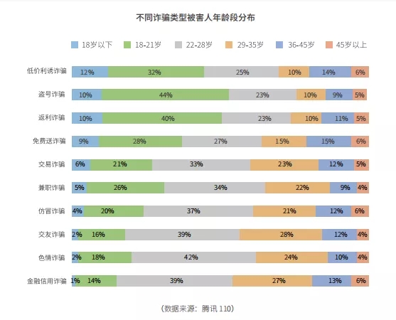 正在读书或是刚步入社会的年轻人(18-21岁)因经济能力有限,成为支付返利、免费送、低价利诱、招聘兼职等骗术的主要实施对象;而有一定工作经验的年轻人(22-28岁),一方面已具备一定的经济基础,另一方面存在情感、婚恋等方面的客观需求,故在色情、网络交友、金融信用方面遭遇诈骗比例较高。
