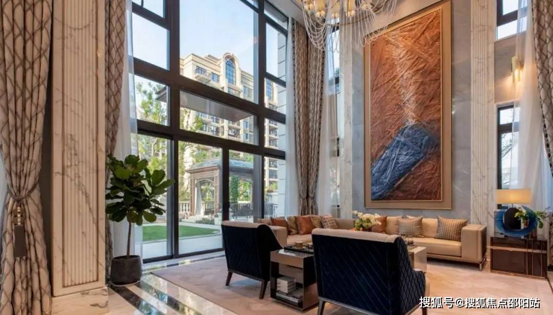 并且地下室层高约4.5米,总面积450㎡,三连厅设计,庭院处可以装得下一个13米长的游泳池,很有巨邸豪宅的气场。
