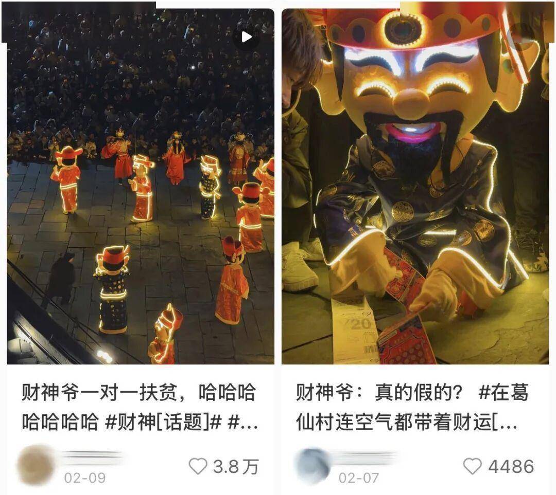 这座位于道教名山葛仙山脚下的国家4A级景区,2020年开始试营业,最开始还是兜售各种自然风景,直到今年,突然变得浓眉大眼起来。年前推出发光财神游街活动,乍一看就是极其普通成群财神coser出街,你大抵也在老家街边的公园也见过类似的手搓财神,但突然一个小道消息在互联网上传开——